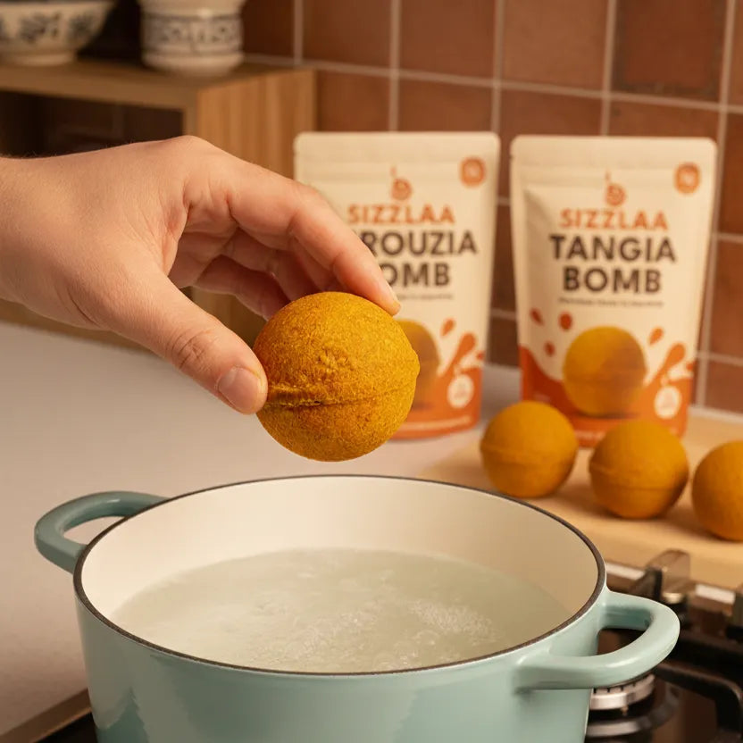 Step 2: Add the Mrouzia Bomb Add 1 cup of water per serving along with the Mrouzia Bomb. Cover and simmer gently for about 2.5β3 hours, until the meat is tender and infused with flavor.